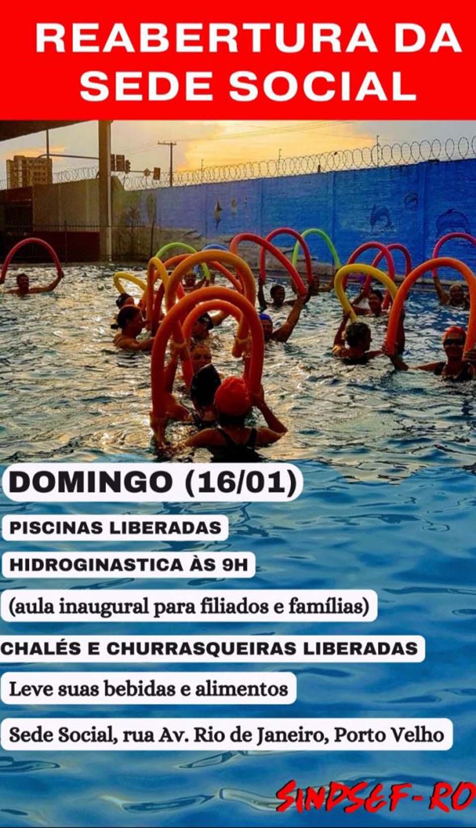 A reabertura da Sede Social terá inicio no domingo, com a realização de aula inaugural de hidroginástica, às 9 horas. No dia 21, será lançado o projeto ‘Sindsef Sextou’, com programação cultural e música ao vivo, a partir das 17 horas.